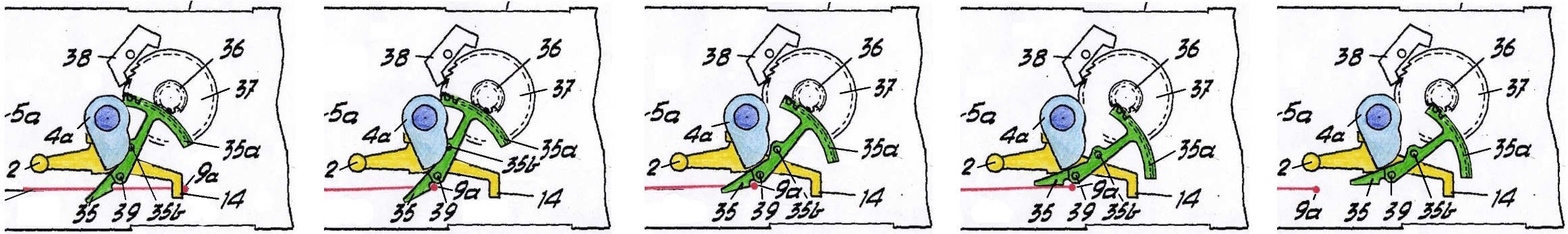 In the picture below you can see that the blade’s hook 9a, pulled to the left by the spring, rotates the lever 35 clockwise around its pivot point 39. The rotational movement is transferred to the gear (escape wheel) 37 via the sector gear. However, this gear is prevented from rotating freely by the anchor 38. Since the anchor oscillates back and forth around its axis of rotation, it only lets a single tooth of the wheel 37 pass each time. The oscillation frequency is always the same and so the escape wheel 36/37 always rotates at the same very constant speed. This principle is also used in mechanical clocks, see video here.