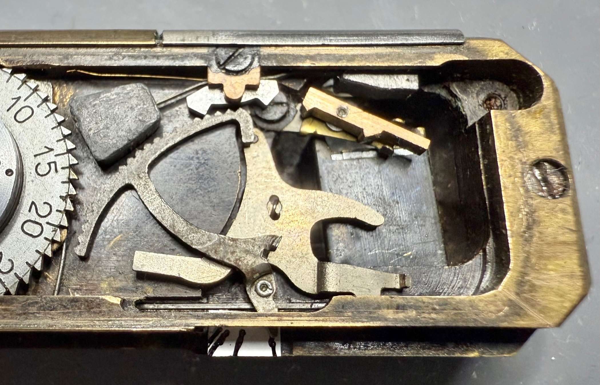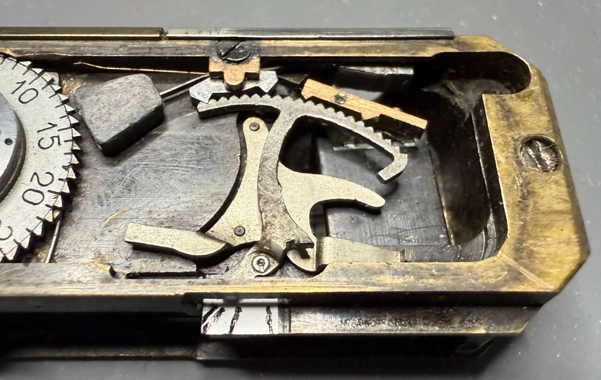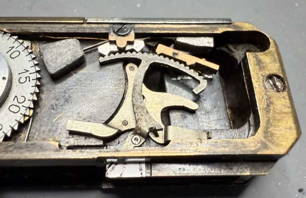 As can be seen in the following image, the actual design differs significantly from the patent description. Many thanks to Burkhard Fenner for providing me with the following explanation, photos and video. He also discovered why the Riga Minox actually has two anchors. He gained these insights into the Riga Minox, and much more, during his restoration of a VEF Minox Riga, which is described here for the first time.